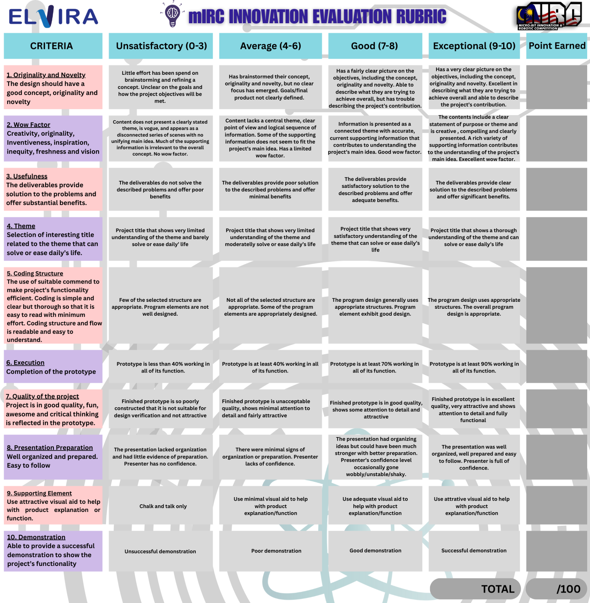 - Untuk pusingan awal, setiap kumpulan hendaklah menyediakan video pendek berdurasi maksimum 5 minit untuk menerangkan projek dan demonstrasi fungsi projek inovasi yang dihasilkan.